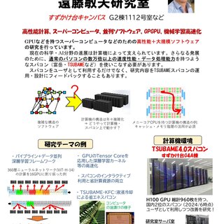 東京科学大学遠藤研究室では、 スーパーコンピュータをはじめとする高性能計算システムのための ソフトウェアやアルゴリズムなどの研究を、 TSUBAME4.0スパコンなどを用い行っています(2024年9月までは東京工業大学遠藤研究室)。 近年はGPUを用いたディープラーニングの大規模化・高速化の研究も行っています。 スパコンアーキテクチャは年々、並列度の増大や、メモリ階層の複雑化など、変遷し続けています。 それらを利用しやすくするソフトウェアやアルゴリズムの進展が求められており、 本研究室では関連の深い研究室や異分野の研究室とも共同して研究に取り組んでいます。